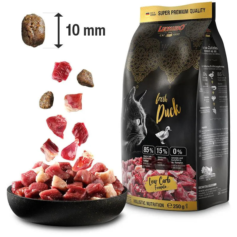LEONARDO Fresh Duck ofrece el puro placer de la carne con una receta premium para gatos adultos: 85% pato fresco + ave fresca, 15% ingredientes holísticos y 0% cereales y patata. Una croqueta muy palatable y digestible que respeta el patrón nutricional natural de los gatos.