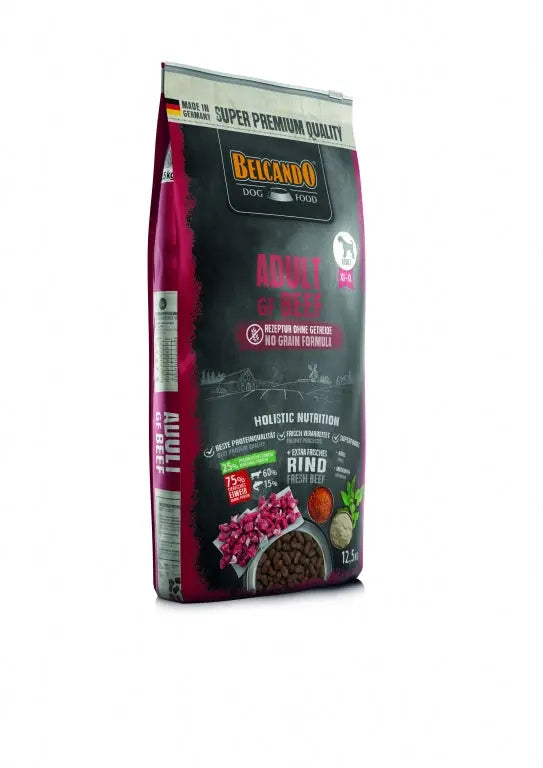 BELCANDO Adult GF Beef es una receta holística sin cereales para perros adultos de todas las razas, diseñada para ofrecer una nutrición completa y equilibrada con un sabor excepcional. Su alta proporción de ternera fresca la hace especialmente atractiva para perros con poco apetito o paladares exigentes, y es una opción ideal cuando se busca evitar proteínas de ave, como el pollo.