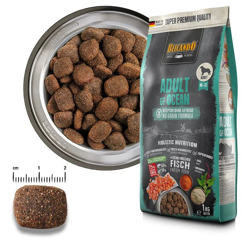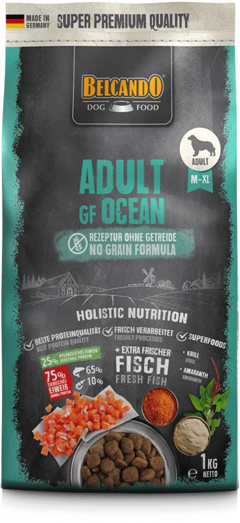 Disfrute puro del mar. BELCANDO Adult GF Ocean está formulado para perros adultos que necesitan una receta sin cereales y, sobre todo, sin proteínas de animales terrestres. Su base es el salmón fresco, combinado con proteínas de pescado oceánico y krill antártico procedente de pesquerías sostenibles.