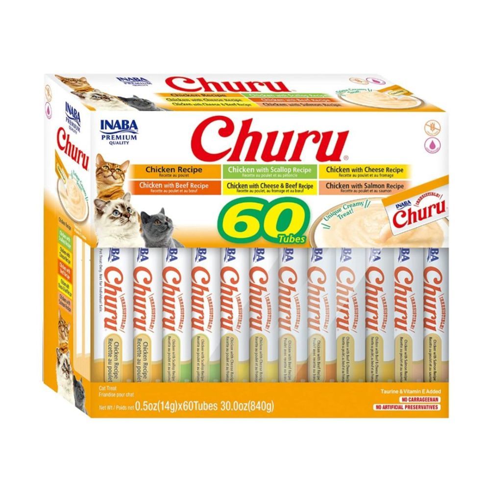 Churu Variety Box es un pack surtido de snacks lamibles tipo puré para gatos, con una textura cremosa e irresistible para dar directamente del tubo, servir en un bol o usar como topping sobre comida seca o húmeda.